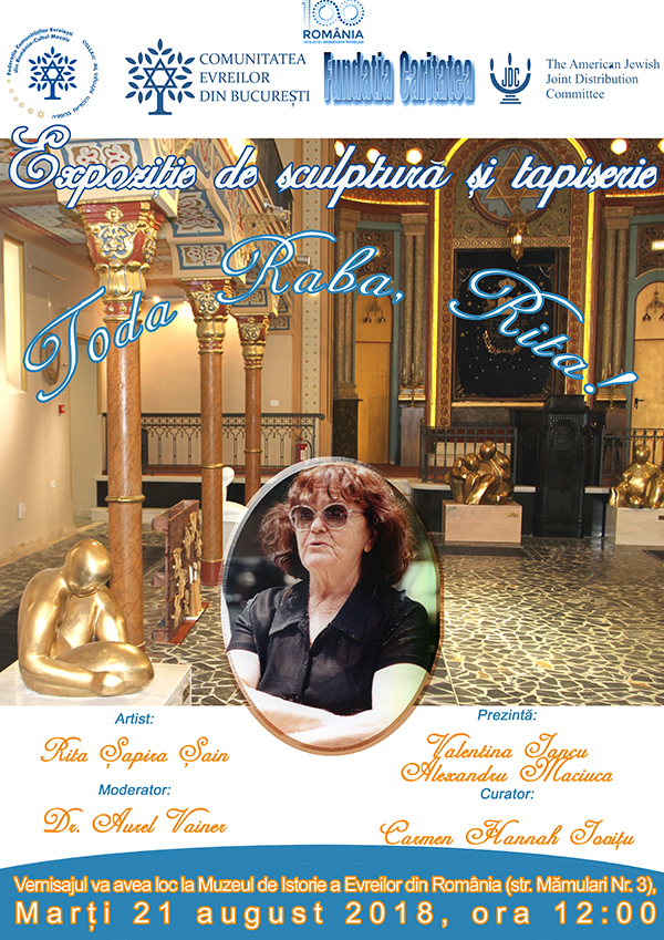 Muzeul de Istorie și Cultură a Evreilor din România și artista Rita Șapira Șain au plăcerea de a vă invita la vernisajul expoziției eveniment ”Toda Raba, Rita!”, marți 21 august 2018, ora 12h00, în str Mămulari, nr 3.